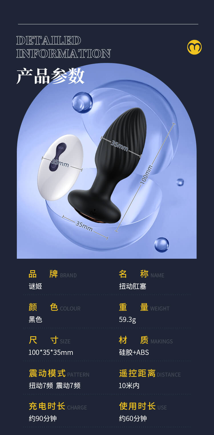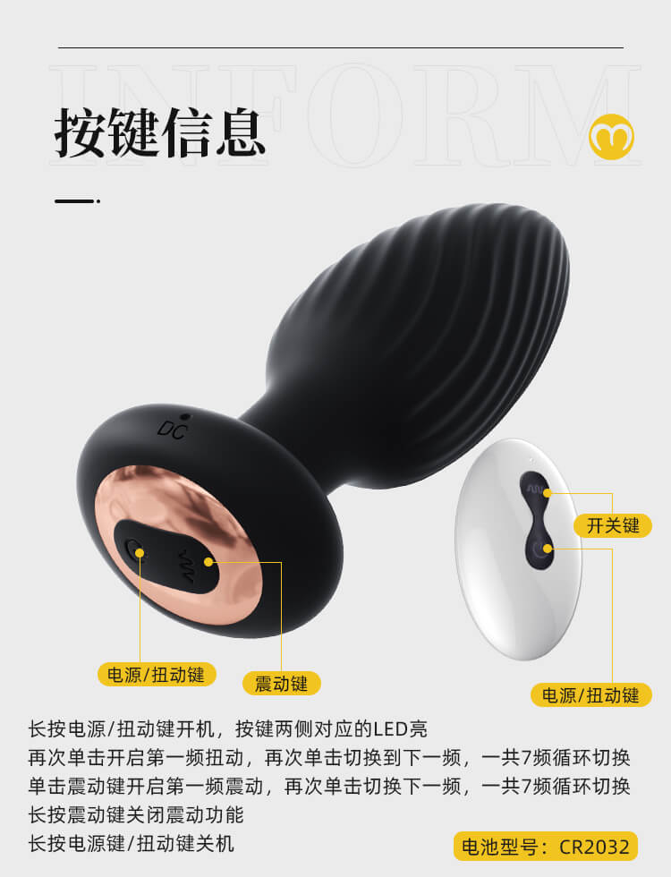 | * | This ergonomically designed anal plug is perfect to stimulate your prostate, ass, and other sensitive zones. This high tech anal plug comes with 7 unique vibration and 360 degrees rotating stimulation patterns to deliver on the big orgasm. For additional fun, give the remote to your lover. The anticipation and surprise as they take charge makes the butt plug even more fun! The remote control works up to 10 feet away, allows you to control the plug while using it at the same time. |